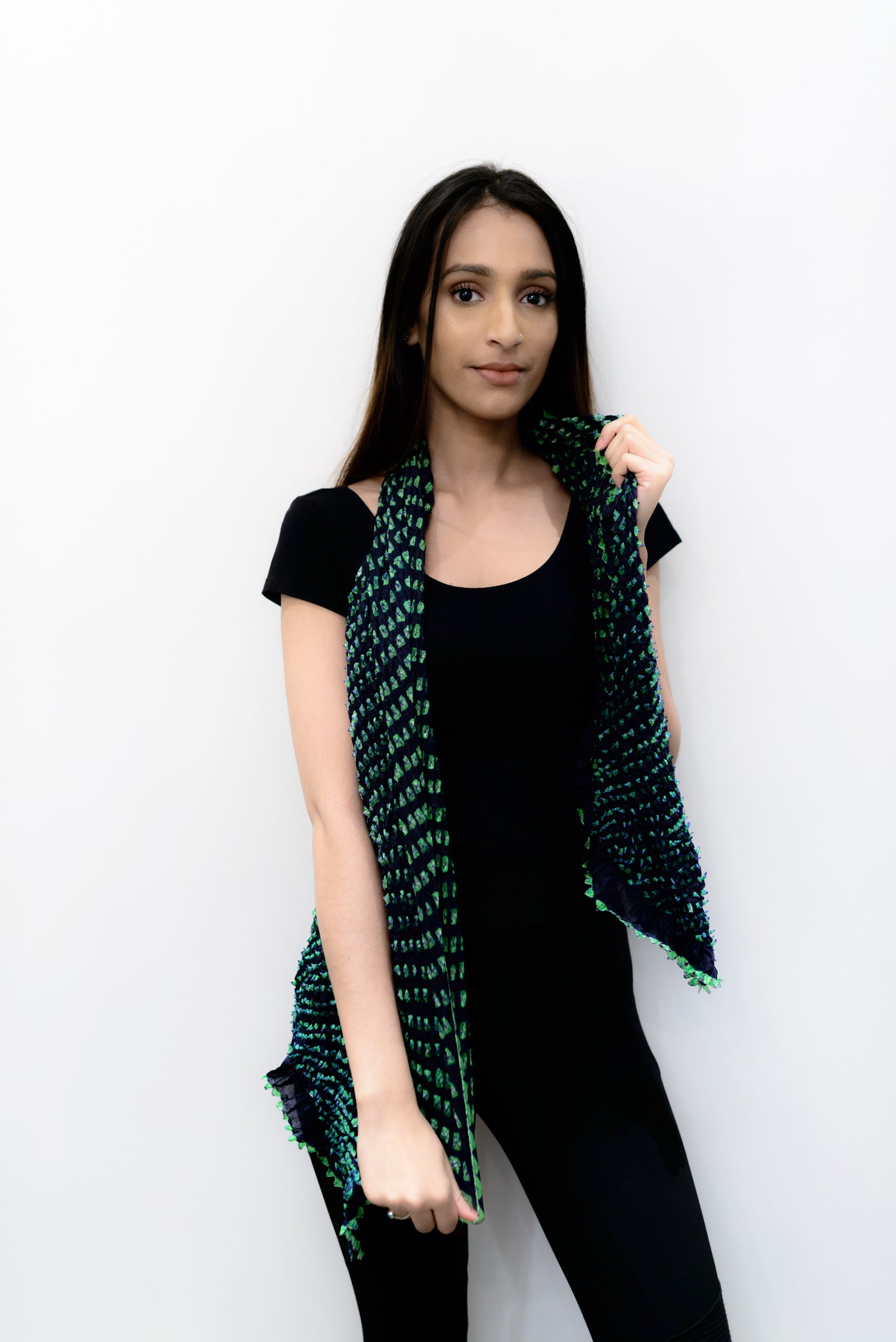 Mulberry silk black and green color bandhani stole.