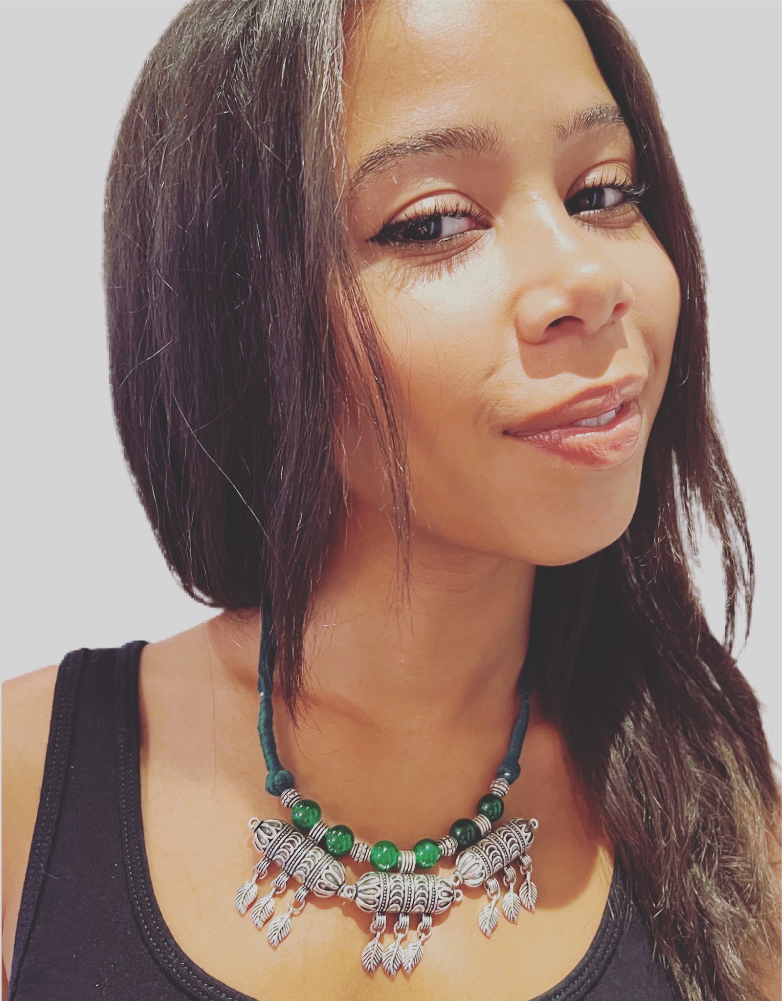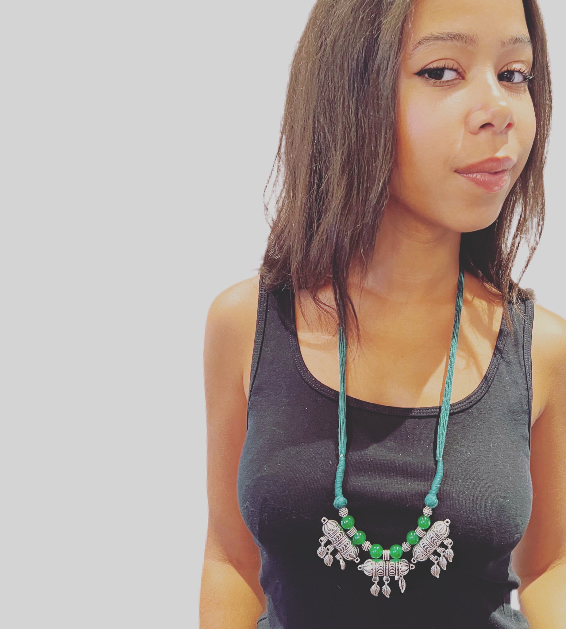 Boho necklace made from green threads, beads and german silver with an adjustable length.