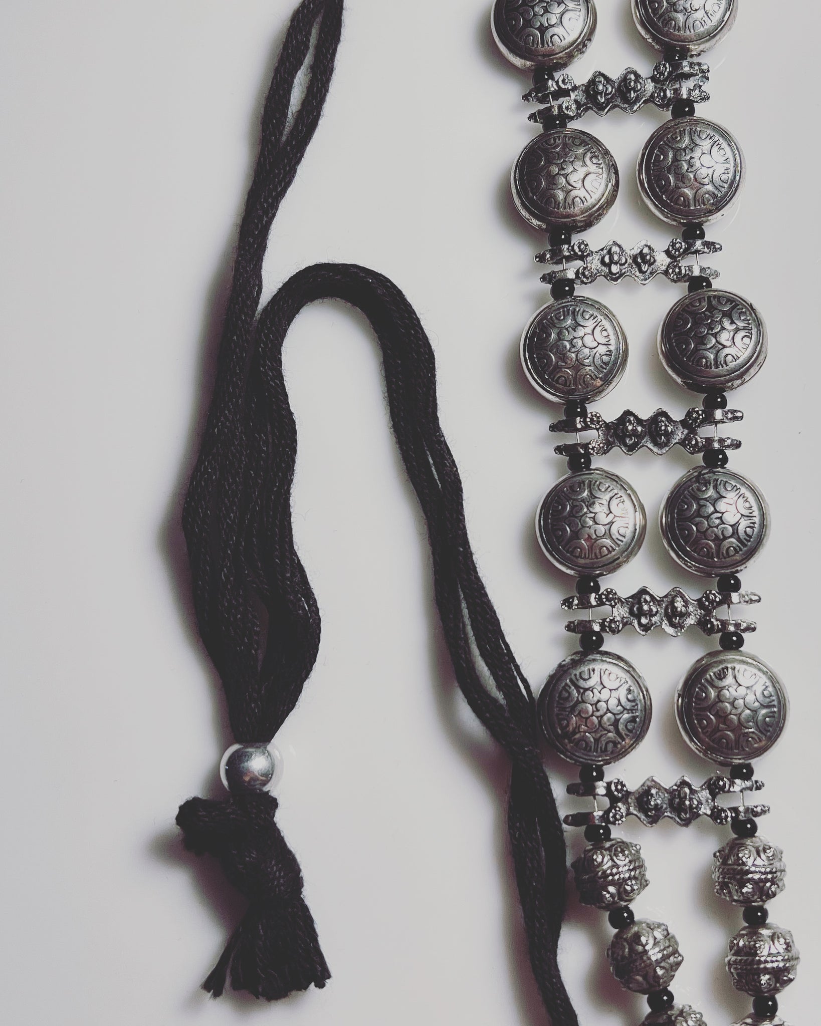 To embody your free spirit. Adjustable length. The choker is made of german silver and black thread.