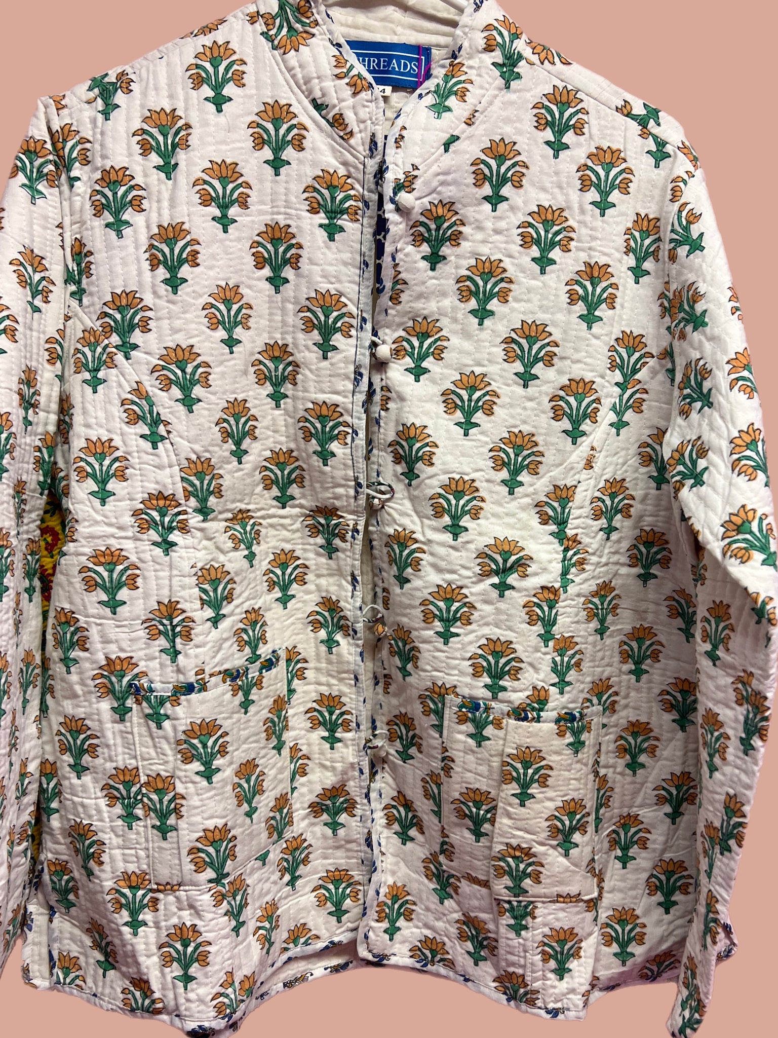 Pure cotton block print quilted short jacket in L/XL.