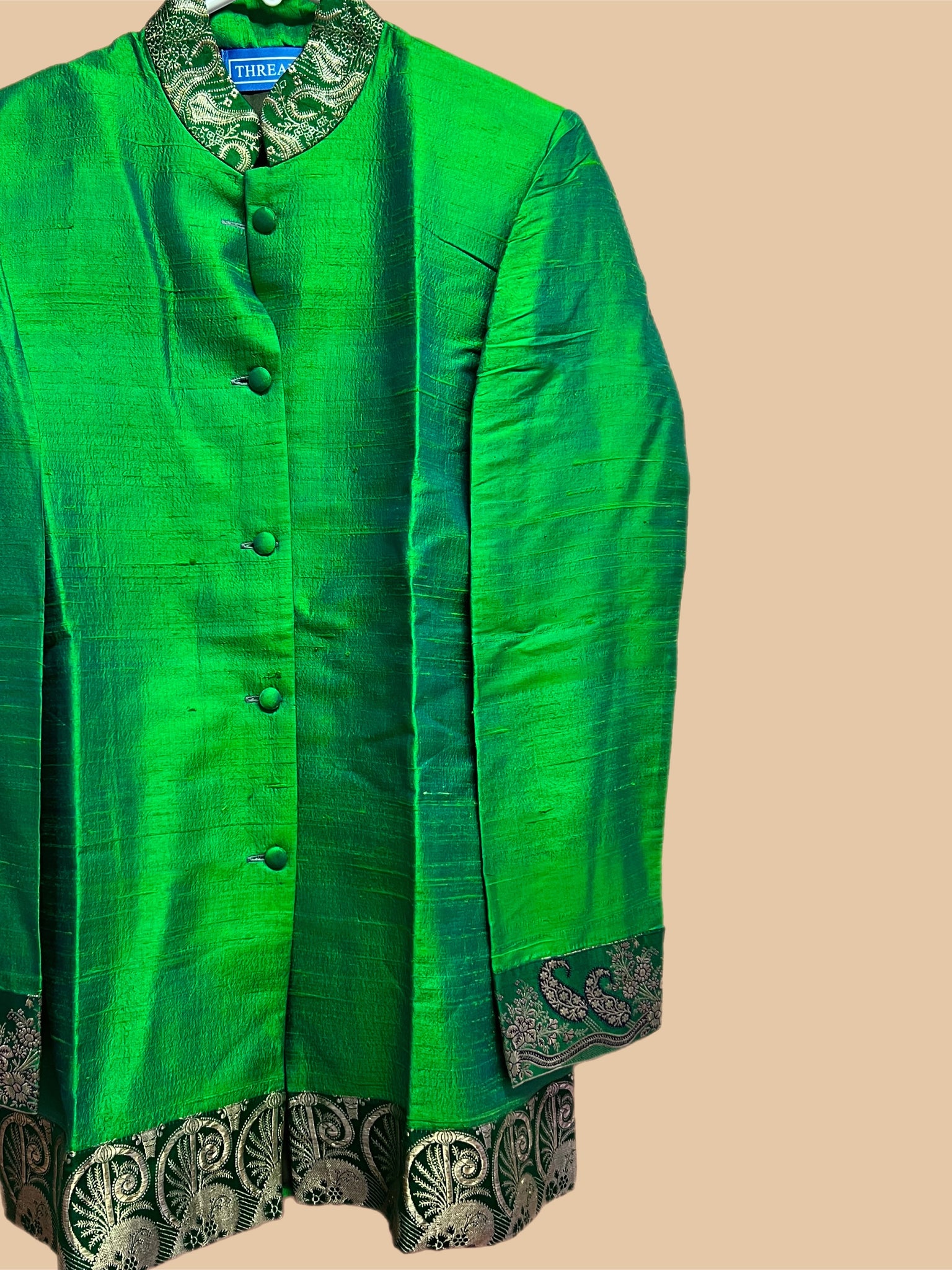 Raw silk short jacket in green with borders in golden thread work. Read more