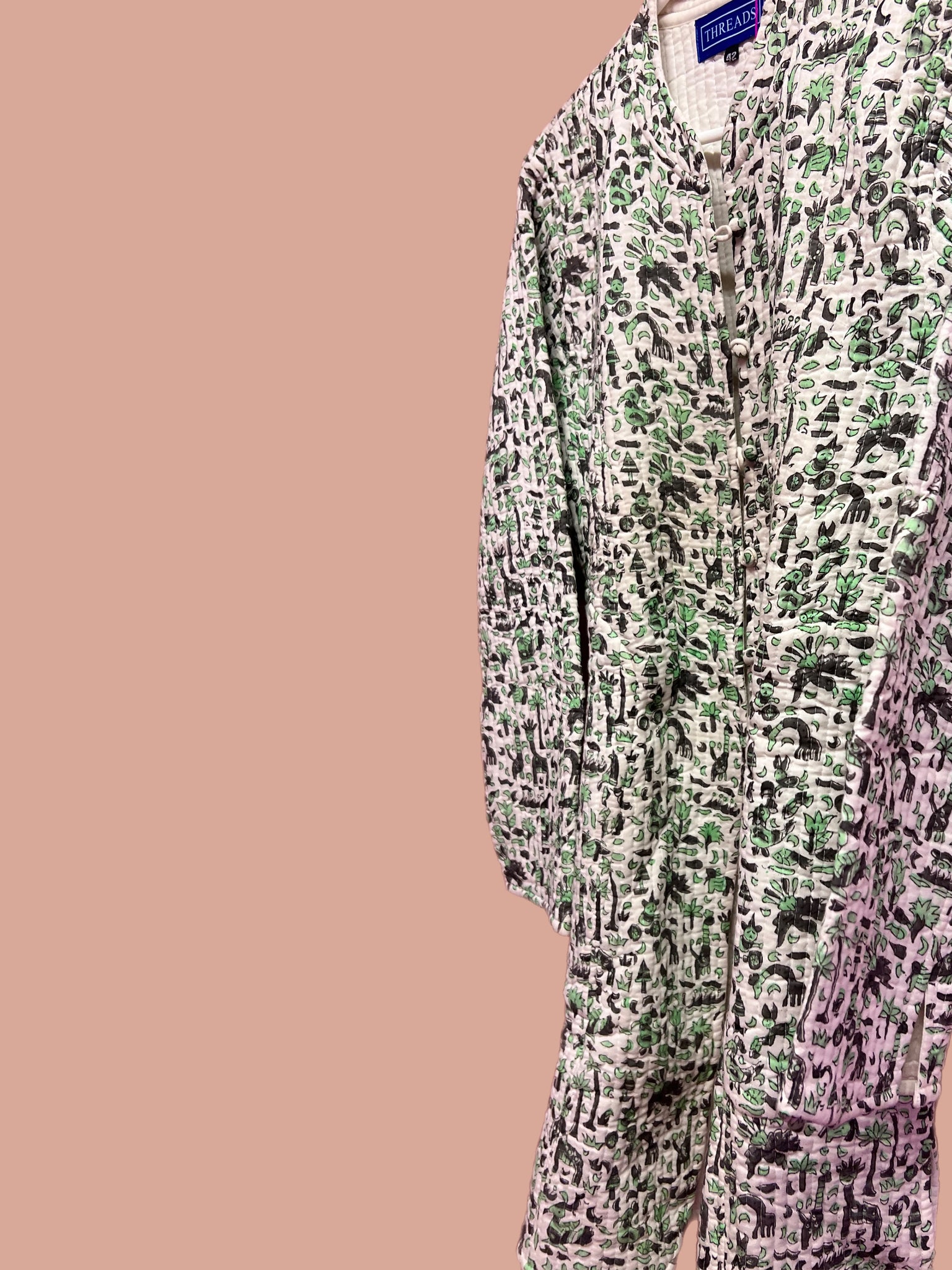 Quilted block print knee length jacket in pure cotton. Large size.Read more