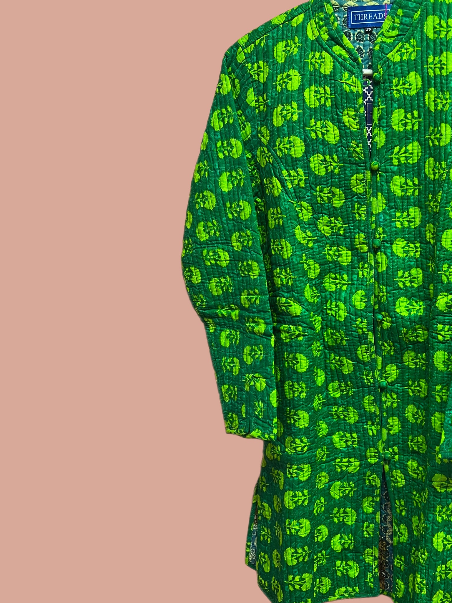 Quilted pure cotton block print knee length jacket. Small sizeRead more