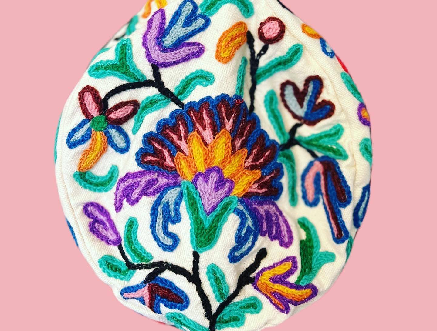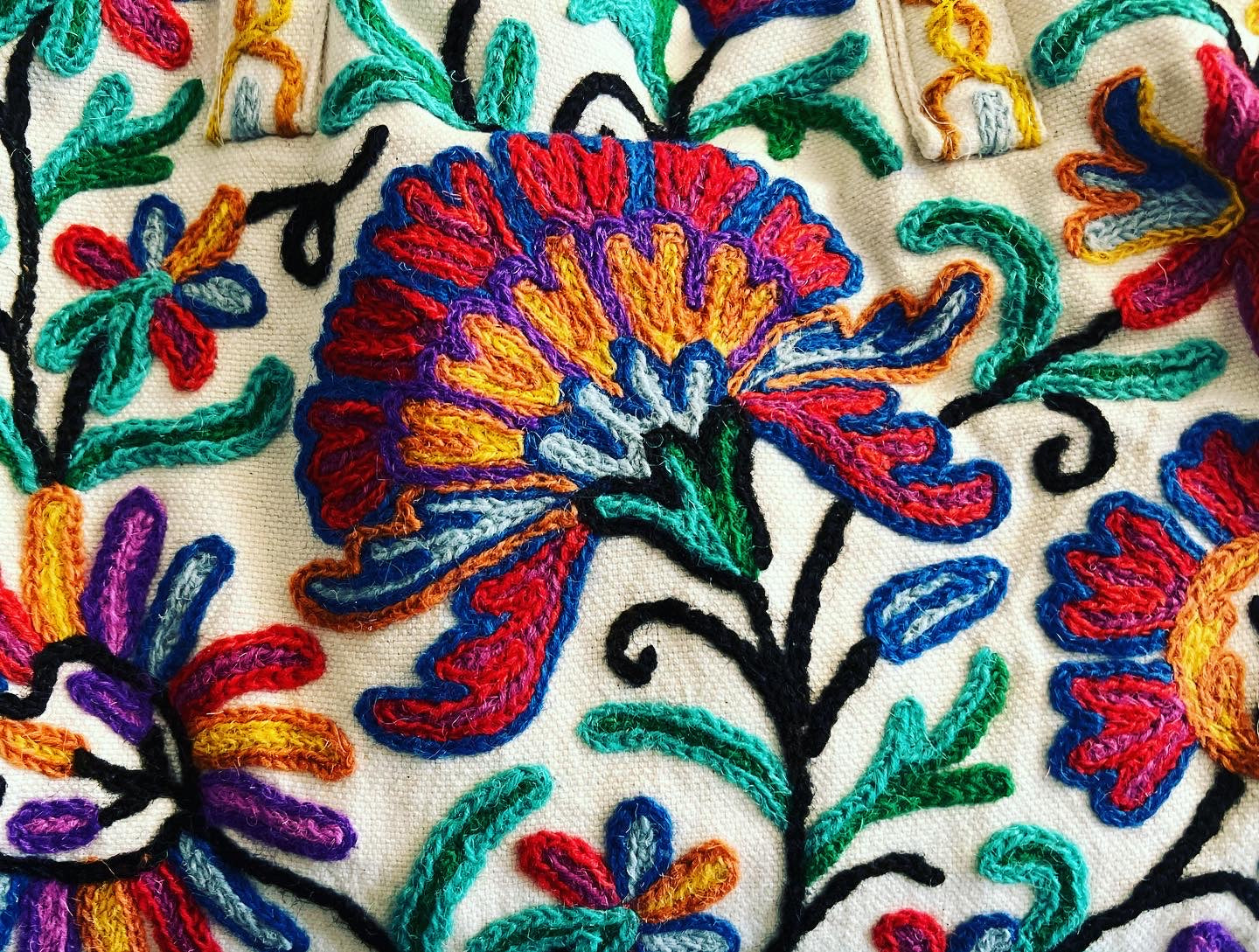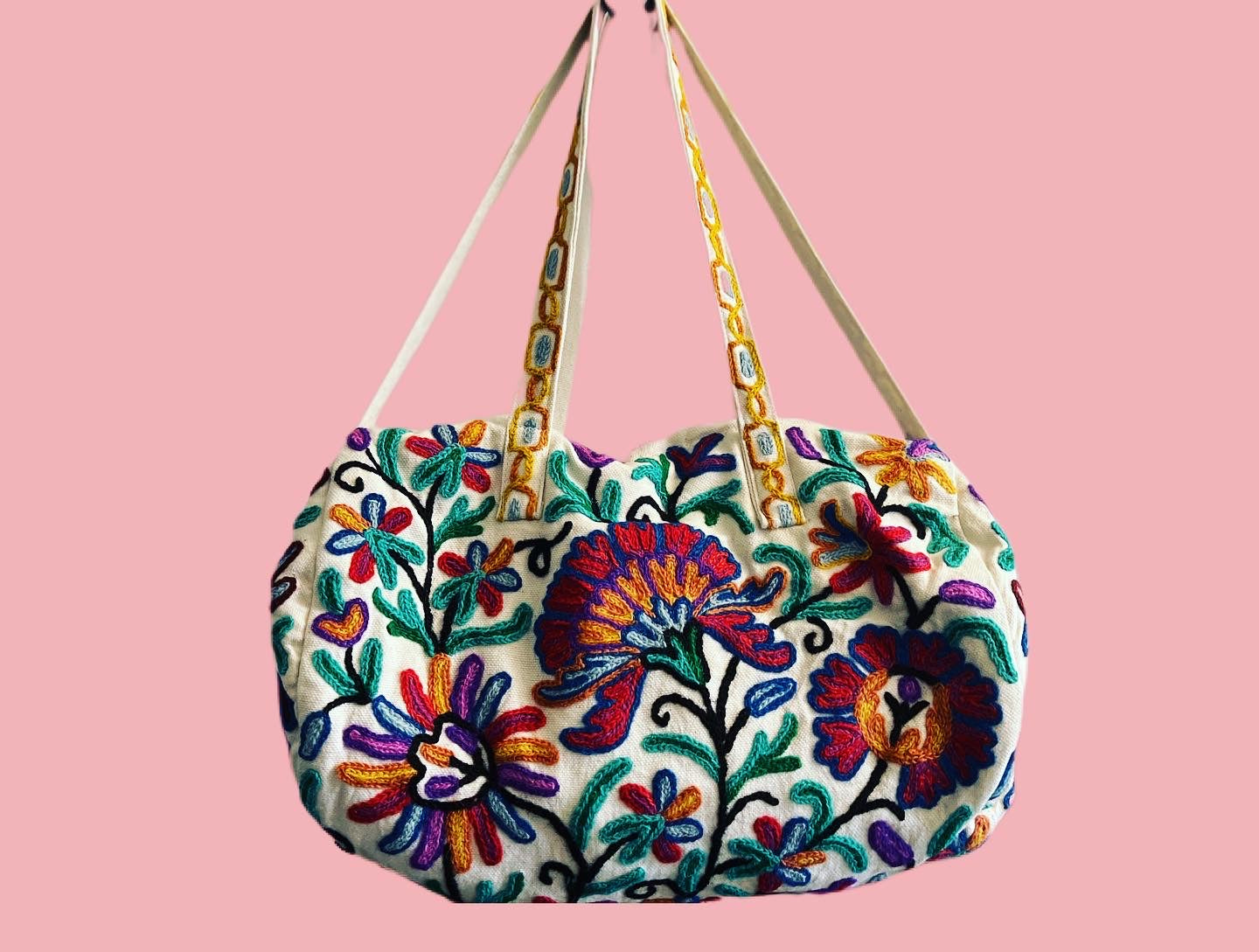 A floral embroidered bag made in Kashmir. Cotton Canvas bag with woolen thread work. Size 14.5 inches by 9.5 inches.
