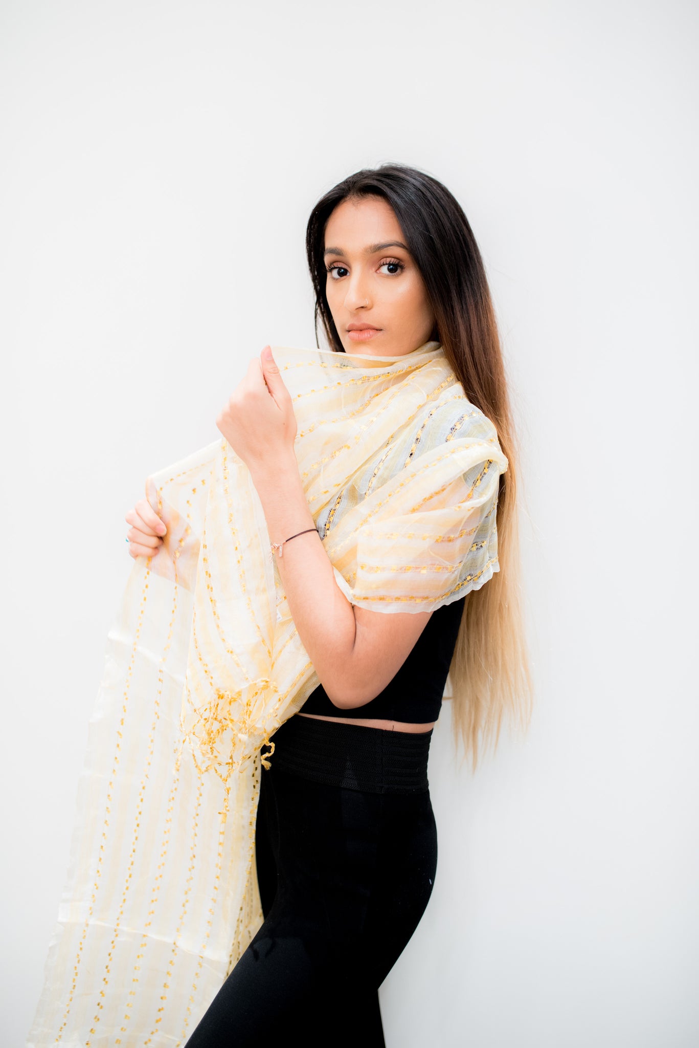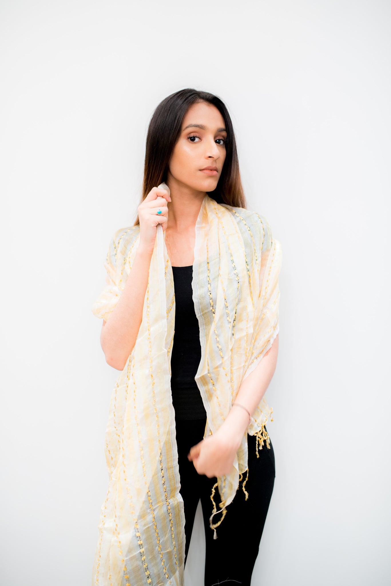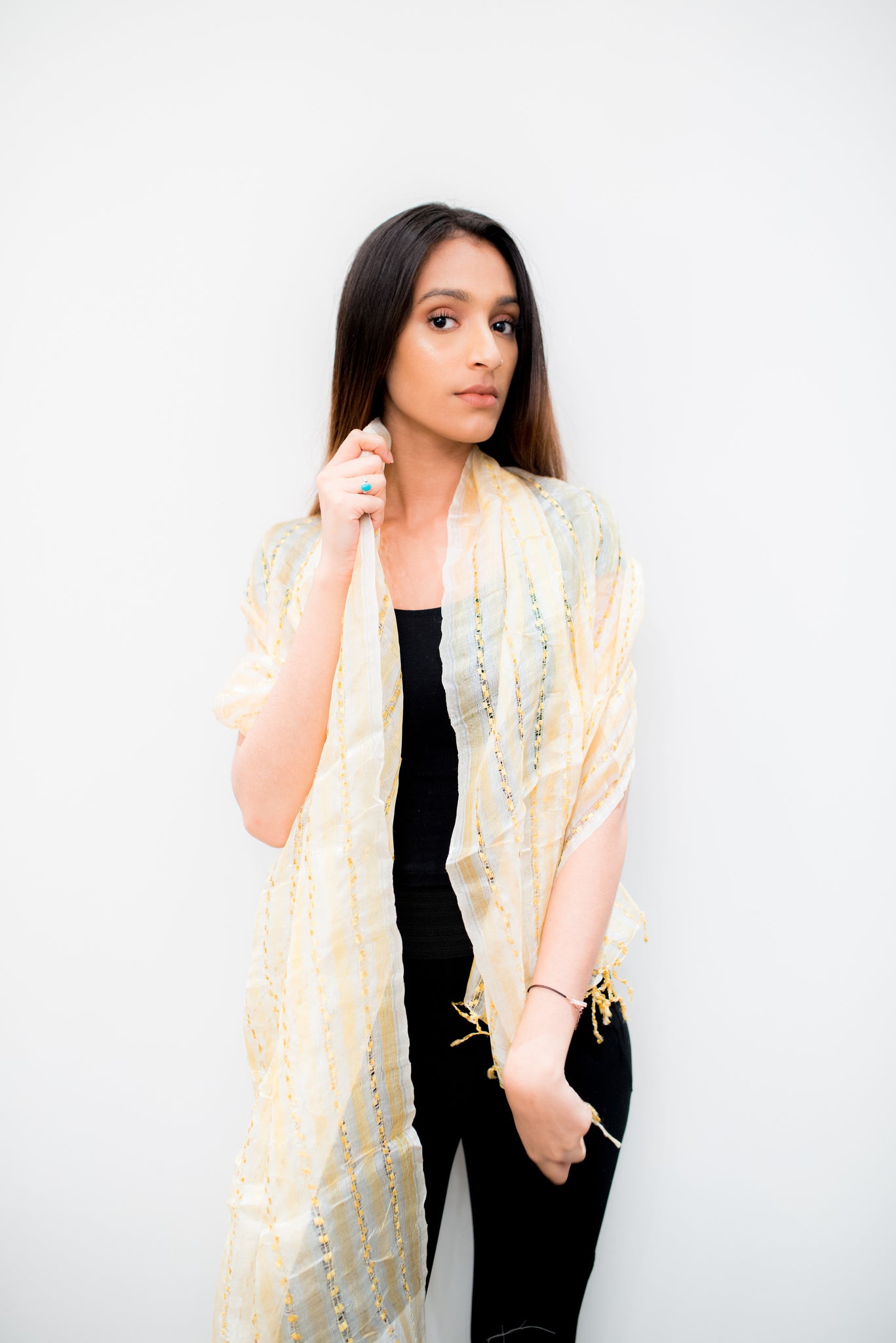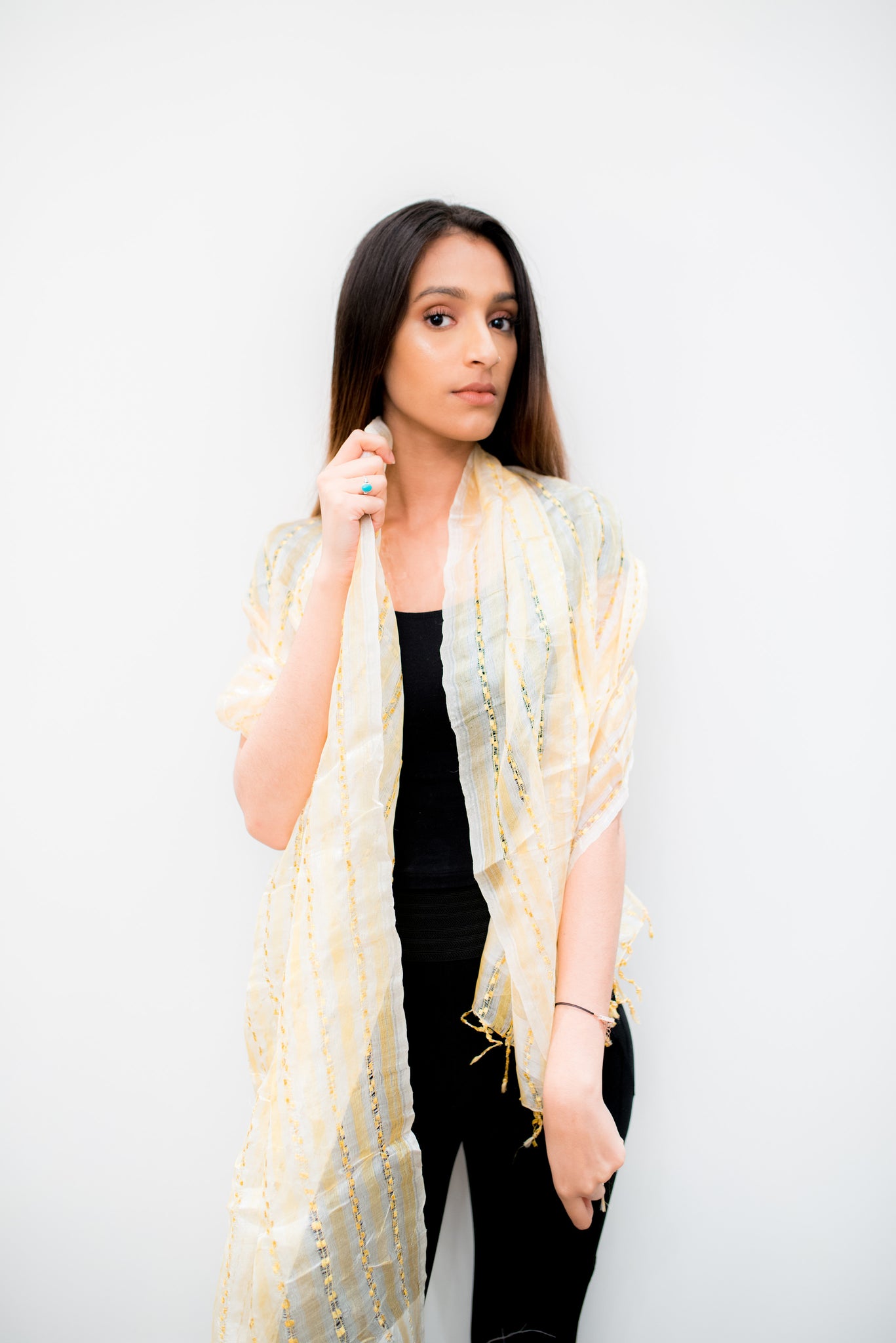 Rich in texture and deep in gold color naturally makes this a sophisticated addition to any outfit at anytime of the day. With thread work.